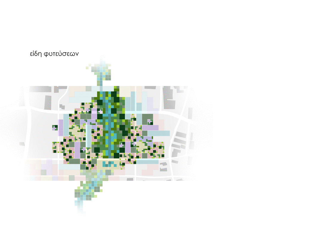 Ύστερα από την επίτευξη της εξυγείανσης του ρέματος αρχίζει η εκτενής φύτευση των όχθων του με υδρόβια φυτά και άλλα χαμηλής κλίμακας. Ενώ, όσο προχωράει το πράσινο προς τον αστικό ιστό η κλίμακα του αναδιαμορφώνεται και φτάνει μέχρι δενδροφύτευση. Η προσέγγιση του ρέματος μπορεί να γίνει μέσω διαδρομών από πλατφόρμες οι οποίες ξεκινούν από τον αστικό ιστό και καταλήγουν στις όχθες του ρέματος κατακερματίζοντας τον όγκο τους στην πορεία. Το ορθοκανονικό τους σχήμα απορρέει από το συνθετικό εργαλείο του τέτρις το οποίο είναι διακριτό σε κάθε σχεδιαστική φάση της λύσης. Η υλικότητα του εκάστοτε πλακιδίου αλλάζει επίσης, αφού σε ορισμένα υπάρχει σκληρό δάπεδο σε άλλα πατημένο χώμα και σε ορισμένα φύτευση πρασίνου. Ο όρος πλατφόρμα δίνεται αφού το ύψος των όγκων αυτών διαφοροποιείται δημιουργώντας πλατώματα και βυθίσματα κατά τη διάρκεια της πορείας προς το ρέμα. Αυτοί οι χώροι που δημιουργούνται μπορούν να χρησιμοποιηθούν ως χώροι δραστηριοτήτων ή ως χώροι στάσης. Οι δραστηριότητες που τοποθετούνται πλησίον του ρέματος θα έχουν άμεση σχέση με το παιδί και θα αναδεικνύουν τη σημασία της φύσης μέσα από εκπαιδευτικές και αθλητικές ασχολίες.